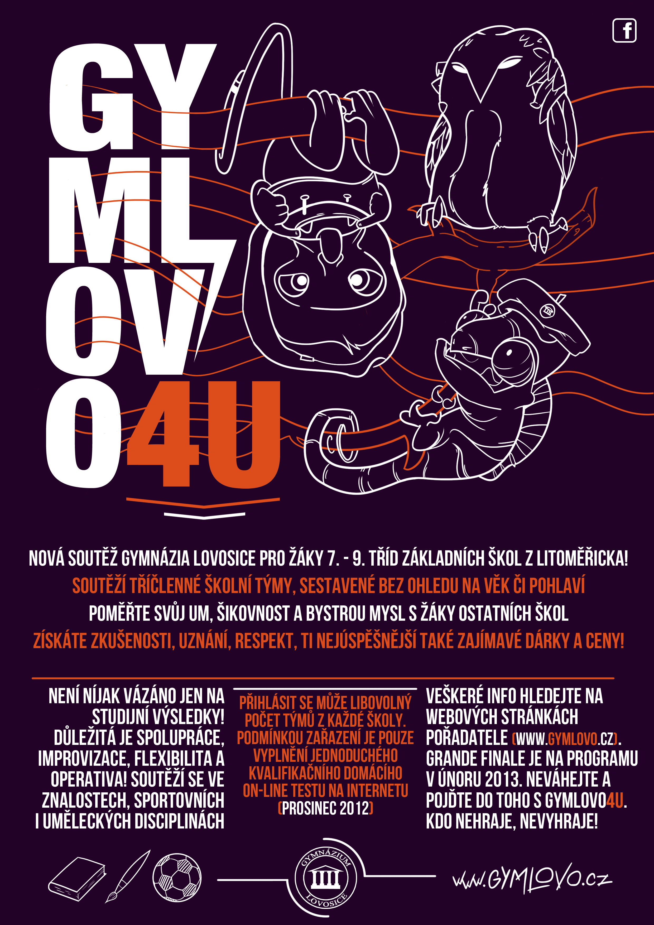 Soutěžní novinka GYMLOVO 4U tak není přístupná jen premiantům, soutěžit může opravdu každý školák. „Důležitější než samotný intelekt a vědomosti jsou v nové soutěži podstatné spíše schopnost a umění hry, spolupráce, improvizace, rychlost, přesnost, bojovnost a týmový duch,“ uvedla k tomu za pořadatelské gymnázium vedoucí projektu Pavla Linková. Podle jejích dalších slov tak stačí dát za školu jakýkoli počet družstev, přičemž tým musí být vždy tříčlenný. Není ovšem již žádný limit, co se věku a pohlaví týče, týmy tak mohou být smíšené a zároveň napříč sedmou až devátou třídou. Kvalifikační kolo soutěže GYMLOVO 4U je na programu v počátku prosince – od 4. 12. bude možné vyplnit velmi jednoduchý on-line test na webu lovosického gymnázia (www.gymlovo.cz), finále přímo na gymnáziu poté přijde na řadu v úvodu února.
